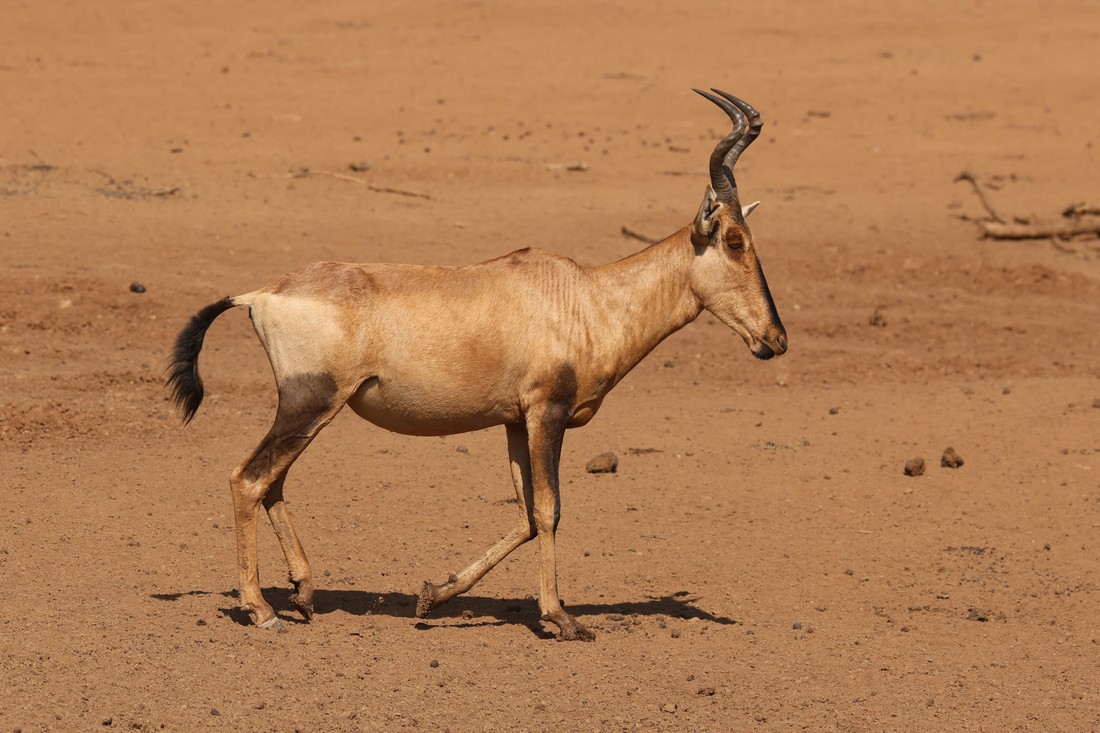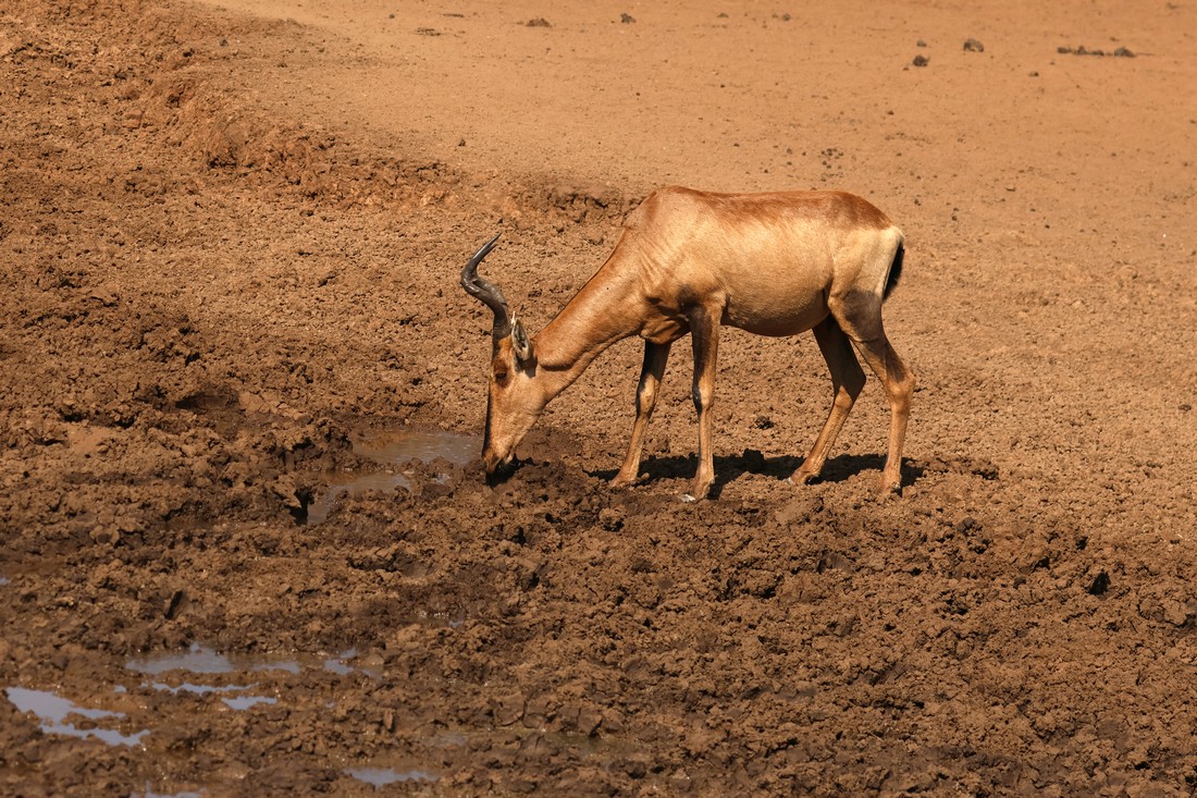 4511 The red hartebeeste approaches an almost dried up waterhole. The rains are due soon