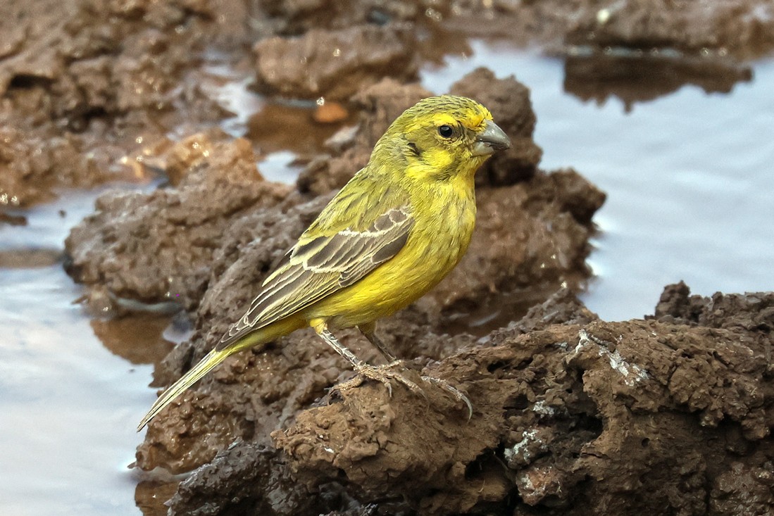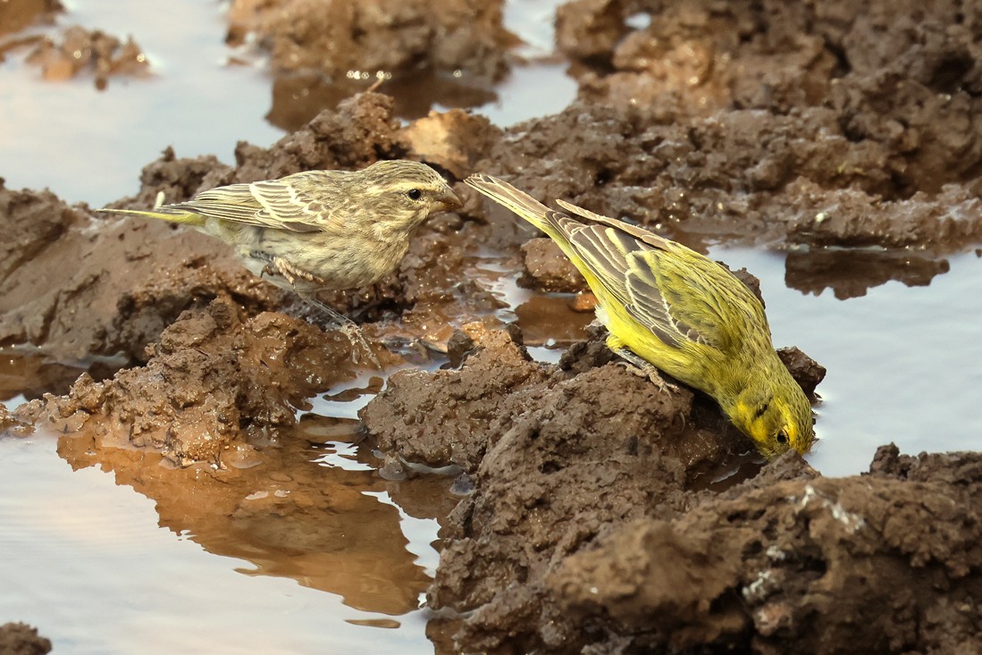 4657 The yellow canary is often seen in large flocks and with other seed eaters such as sparrows and queleas