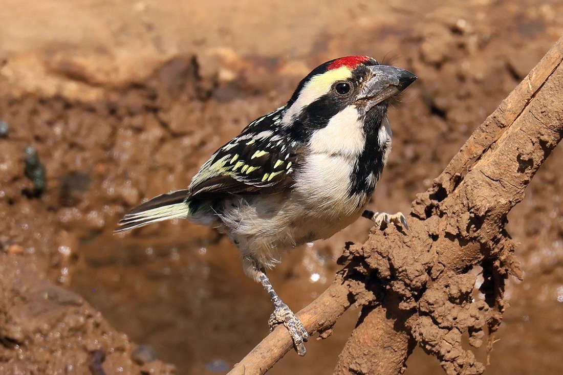 4653 This is an adult acacia pied barbet. Juveniles lack the red forehead