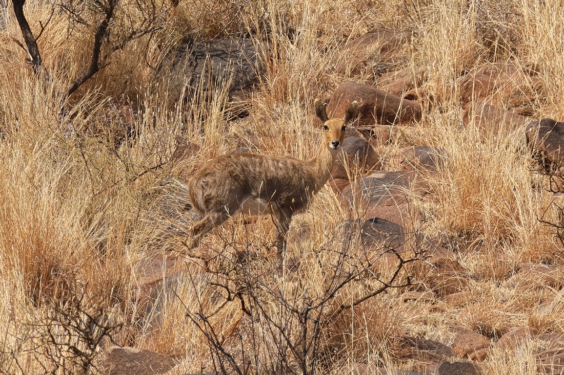 4498 Grey rhebok like dry deeply drained grasslands where frosts limit tree growth. It avoids tall grass so it has a clear view